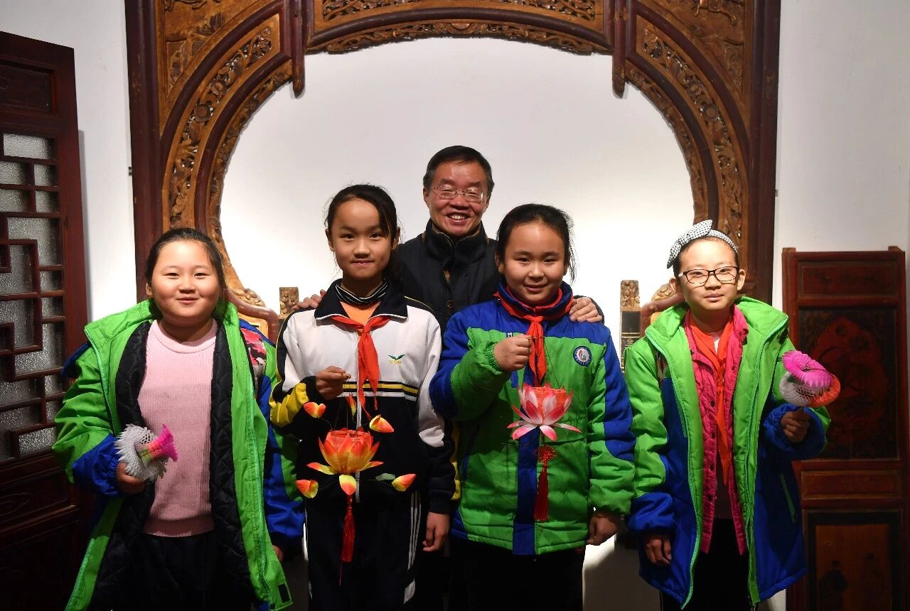 在汴京灯笼张彩灯展览馆,张俊涛与前来参观体验的小学生合影 李嘉南 摄