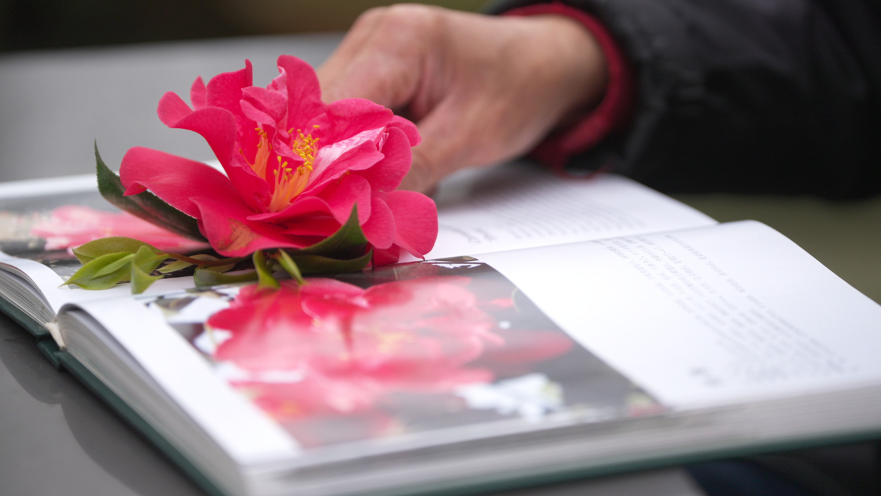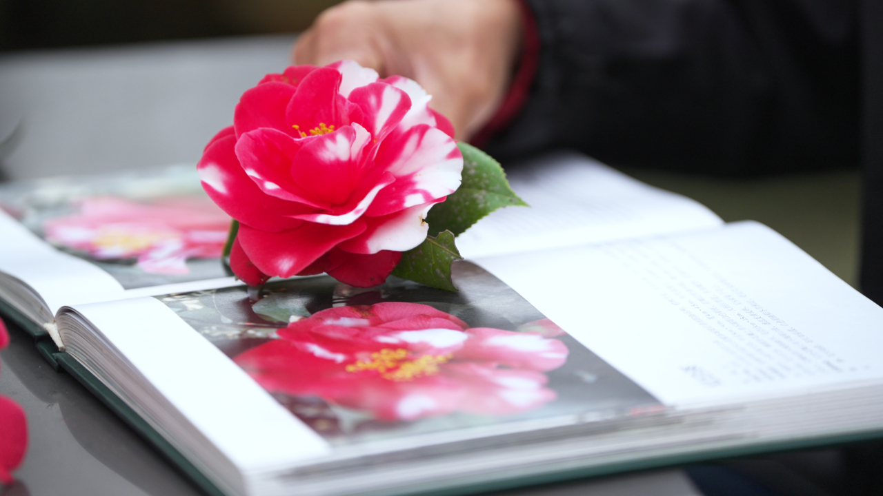 翻开这本《川茶花品种图鉴》,茶花爷爷从茶花树上摘下几朵花,对照讲解起来:“‘帅旗’由‘革命旗’与‘吊钟茶’嫁接而成,花型挺拔;‘红白茶’花瓣色彩红白相间,是嫁接变异后的新品种,我给它以红白命名,是红白社区红峡谷独有的珍稀品种,承载着家乡印记......”